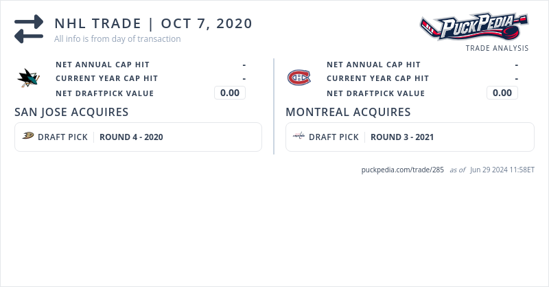 The San Jose Sharks acquired 2020 fourth round pick (#98) from the Montreal Canadiens for 2021 third round pick