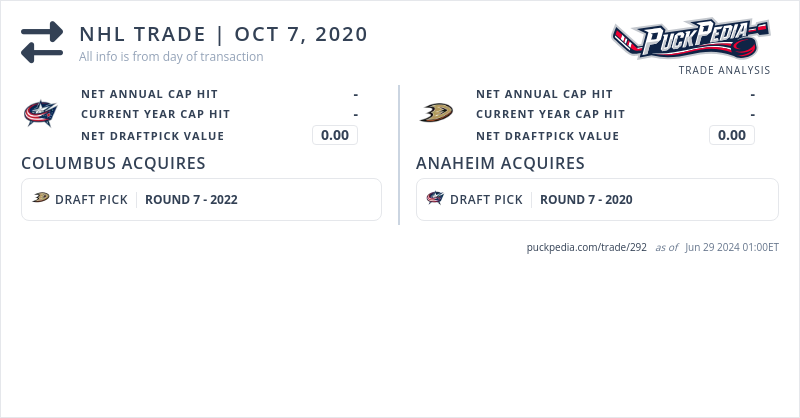 The Anaheim Ducks acquired 2020 seventh round pick (#207) from the Columbus Blue Jackets for a Conditional 2022 seventh round pick