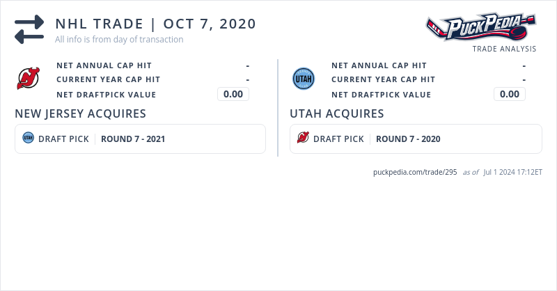 The Arizona Coyotes acquired 2020 seventh round pick (#192) from the New Jersey Devils for 2021 seventh round pick