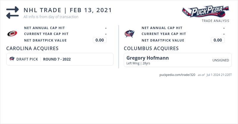 The Columbus Blue Jackets acquired Gregory Hofmann from the Carolina Hurricanes for a 2022 seventh round pick
