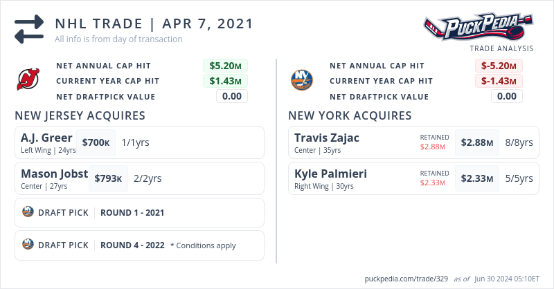 The New York Islanders acquired Kyle Palmieri and Travis Zajac from the New Jersey Devils for A.J. Greer, Mason Jobst, 2021 first round pick and 2022 conditional fourth round pick