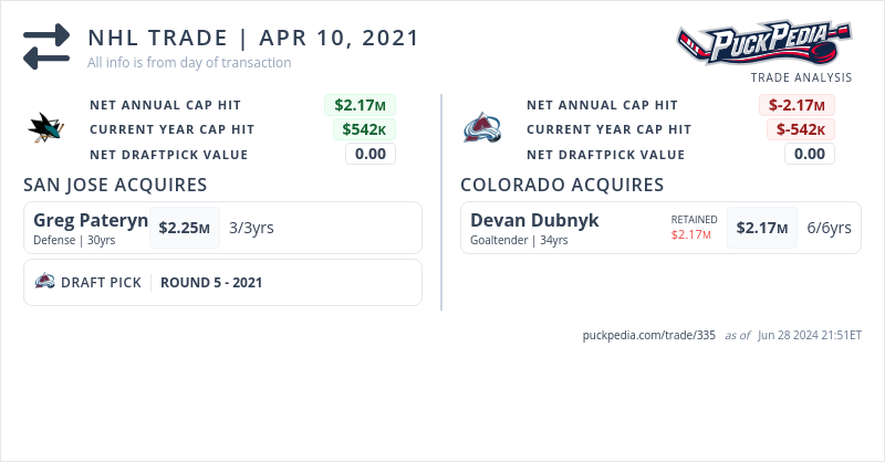 The Colorado Avalanche acquired Devan Dubnyk from the San Jose Sharks for Greg Pateryn and 2021 fifth round pick