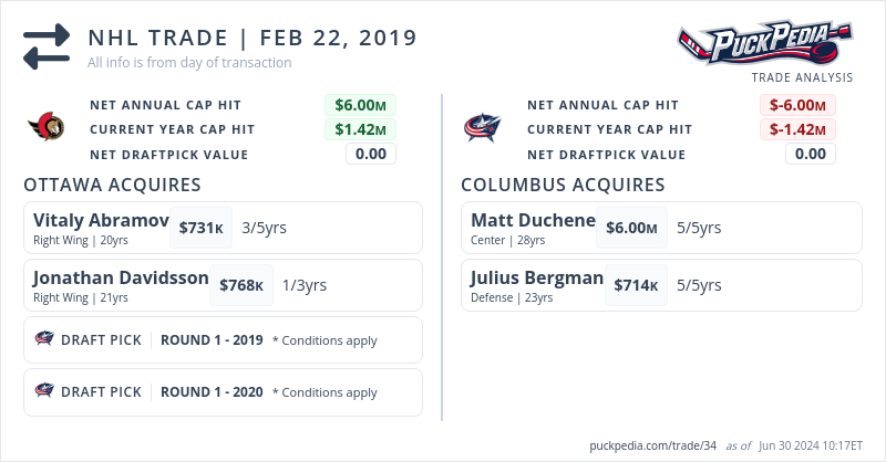 acquired C Matt Duchene and D Julius Bergman from the Ottawa Senators for RW Vitaly Abramov, RW Jonathan Davidsson, 2019 first-round draft pick and a conditional 2020 first-round draft pick. 2020 1st Round Pick to Ottawa if Duchene re-signs with Columbus.