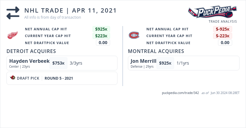 The Montreal Canadiens acquired Jon Merrill from the Detroit Red Wings for a 2021 fifth round pick and Hayden Verbeek