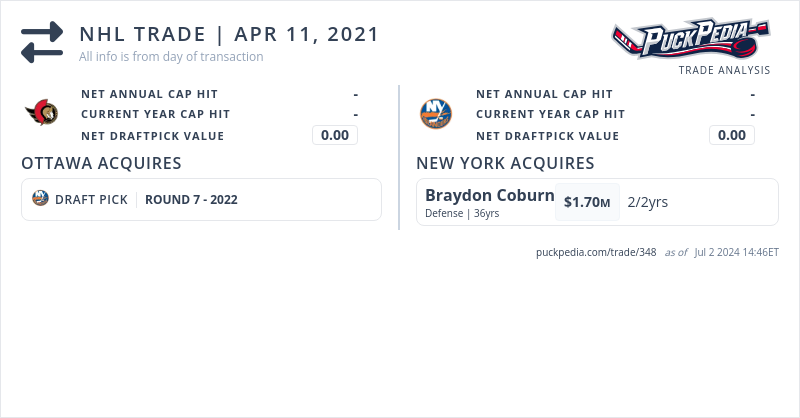 The New York Islanders acquired Braydon Coburn from the Ottawa Senators for a 2022 seventh round pick