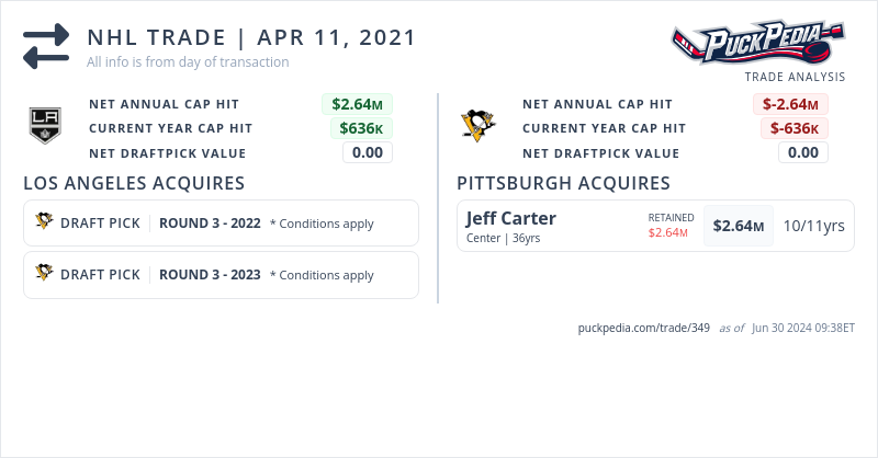 The Pittsburgh Penguins acquired Jeff Carter from the Los Angeles Kings for a Conditional 2022 third round Pick and Conditional 2023 fourth round pick (condition met, upgraded to 3rd round pick)