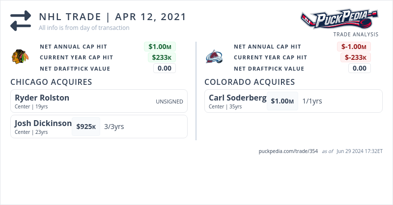 The Colorado Avalanche acquired Carl Soderberg from the Chicago Blackhawks for Josh Dickinson and Ryder Rolston