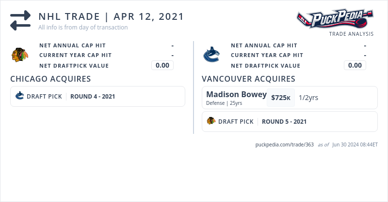 The Vancouver Canucks acquired Madison Bowey and 2021 fifth round pick from the Chicago Blackhawks for 2021 fourth round pick