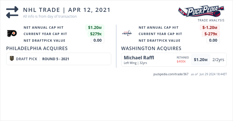 The Washington Capitals acquired Michael Raffl from the Philadelphia Flyers for 2021 fifth round pick