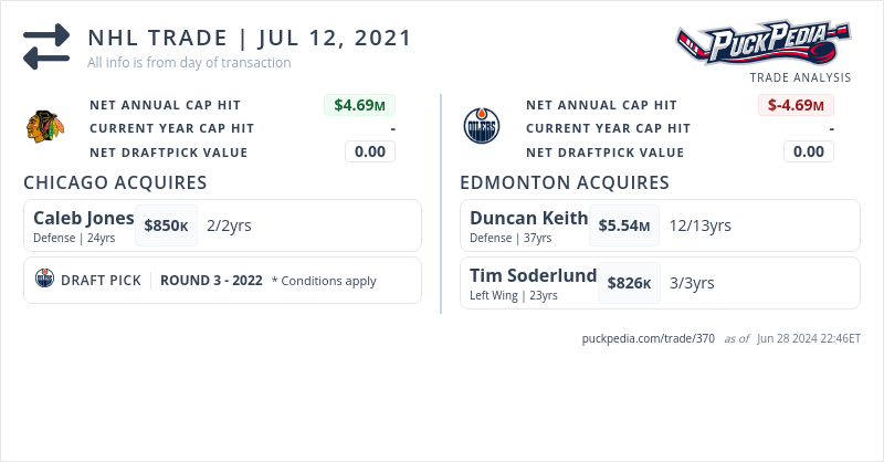 The Edmonton Oilers acquired Duncan Keith and Tim Soderlund from the Chicago Blackhawks for Caleb Jones and a 2022 conditional third round pick