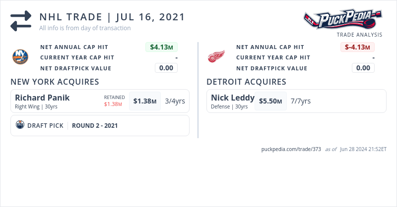 The Detroit Red Wings acquired Nick Leddy from the New York Islanders for Richard Panik and 2021 second round pick (#52 - from Edmonton)