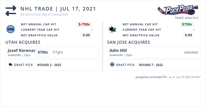 The San Jose Sharks acquired Adin Hill and 2022 seventh round pick from the Arizona Coyotes for Josef Korenar and 2022 second round pick