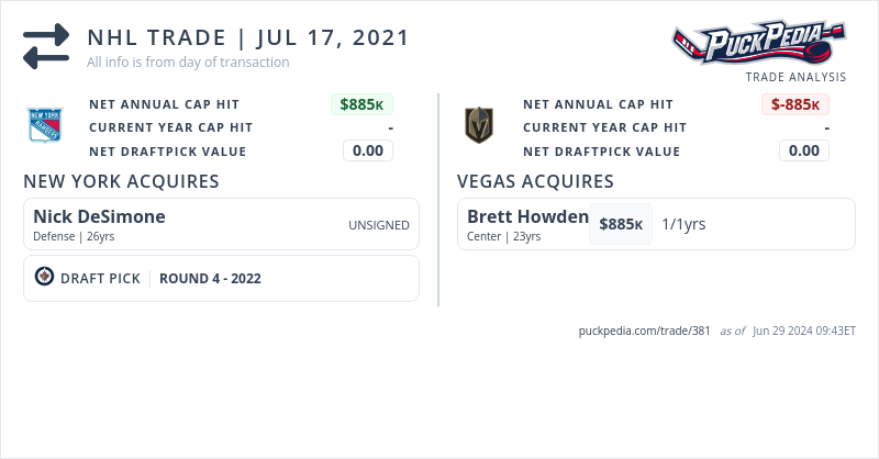 The New York Rangers traded Brett Howden to the Vegas Golden Knights for Nick DeSimone and 2022 fourth round pick