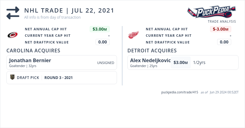The Detroit Red Wings acquired Alex Nedeljkovic from the Carolina Hurricanes for a 2021 third round pick and Jonathan Bernier