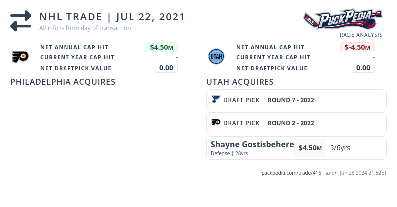 The Arizona Coyotes acquired Shayne Gostisbehere, a 2022 second round pick and 2022 seventh round pick from the Philadelphia Flyers