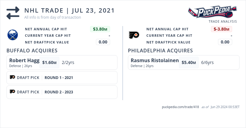 The Philadelphia Flyers acquired Rasmus Ristolainen from the Buffalo Sabres for Robert Hagg, 2021 First Round Pick, and 2023 second round pick