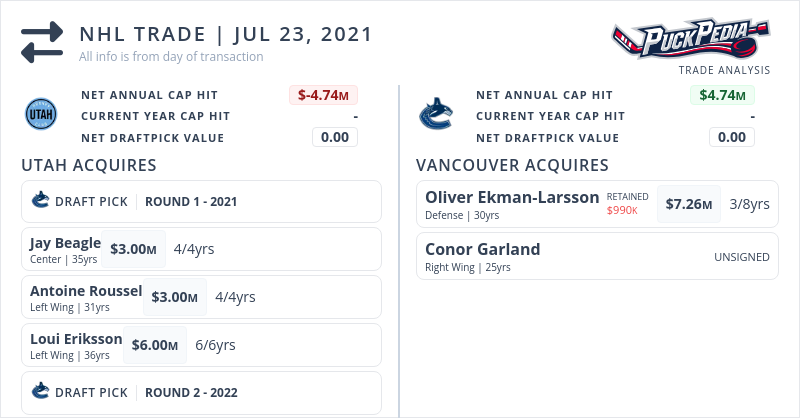 The Vancouver Canucks acquired Oliver Ekman-Larsson and Conor Garland from the Arizona Coyotes for Loui Eriksson, Jay Beagle, and Antoine Roussel, 2021 First Round Pick (#9), 2022 Second Round Pick, and 2023 Seventh Round Pick