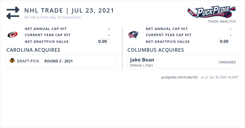 The Columbus Blue Jackets acquired Jake Bean from the Carolina Hurricanes for a 2021 second round pick