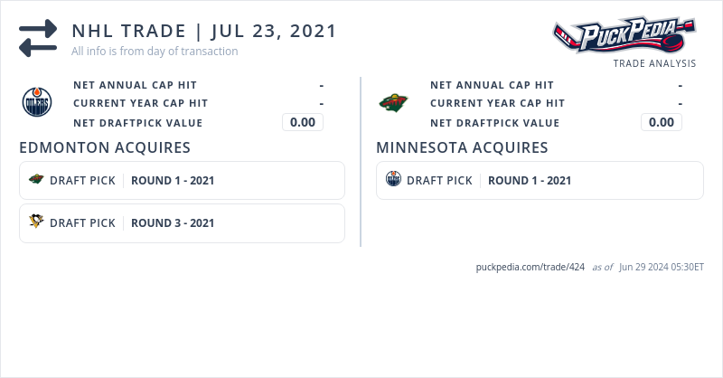The Minnesota Wild acquired 2021 first round pick (#20) from the Edmonton Oilers for 2021 first round pick (#22) and 2021 third round pick (#90)
