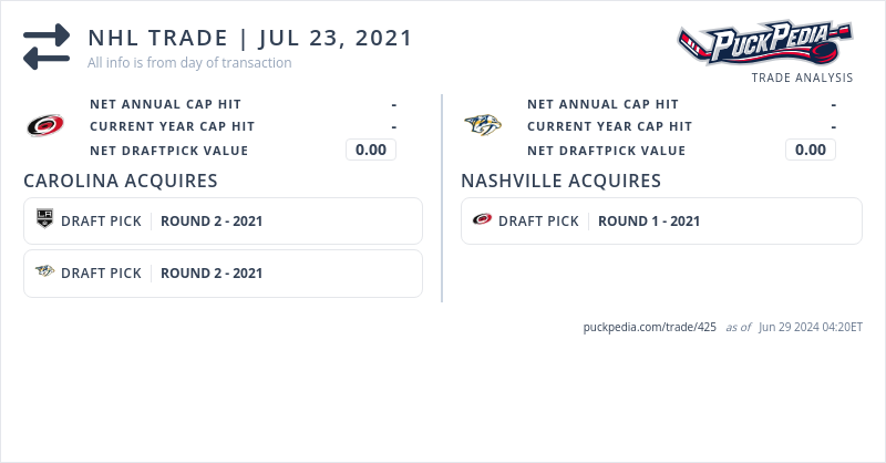 The Nashville Predators acquired 2021 First Round Pick (#27) from the Carolina Hurricanes for 2021 second Round Pick (#40) and 2021 second round pick (#51)