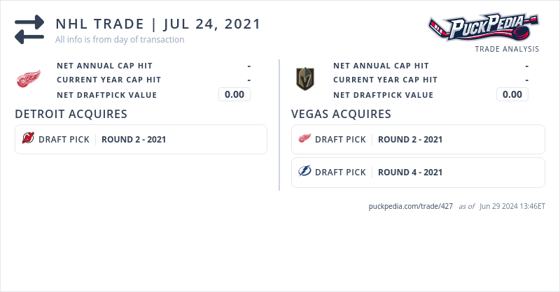 The Detroit Red Wings acquired 2021 Second Round Pick (#36) from the Vegas Golden Knights for 2021 Second Round Pick (#38) and 2021 Fourth Round Pick (#128)