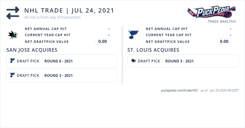 The St Louis Blues acquired 2021 third round pick (#71) from the San Jose Sharks for 2021 third round pick (#81) and 2021 sixth round pick (#177)