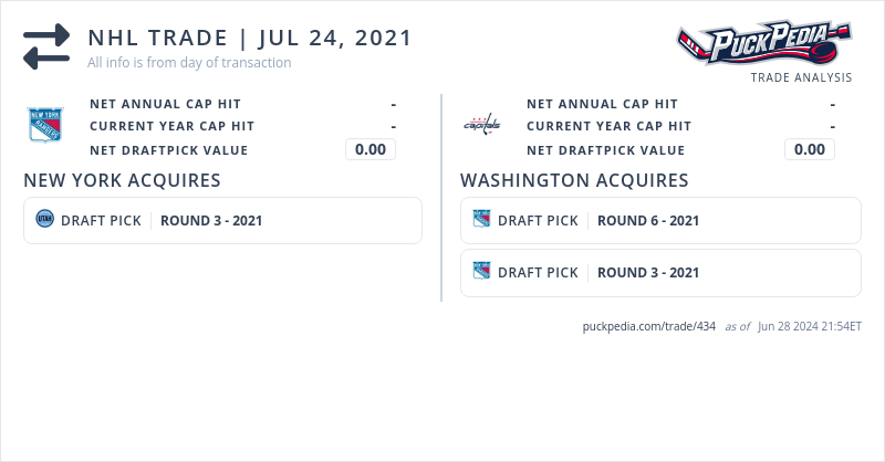 The New York Rangers acquired 2021 third round pick (#75) from Washington Capitals for 2021 third round pick (#80) and 2021 sixth round pick (#176)