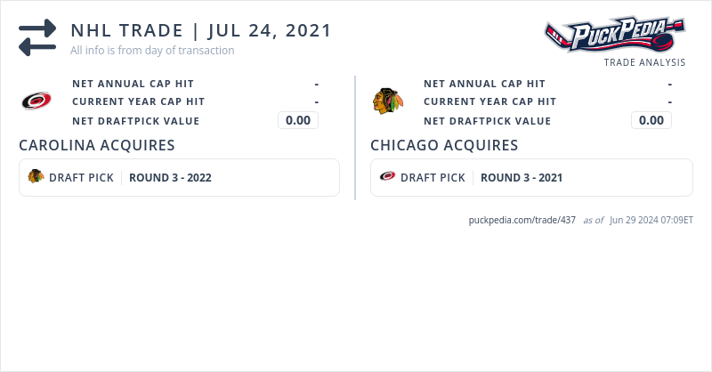 The Chicago Blackhawks acquired 2021 third round pick (#91) from the Carolina Hurricanes for 2022 third round pick
