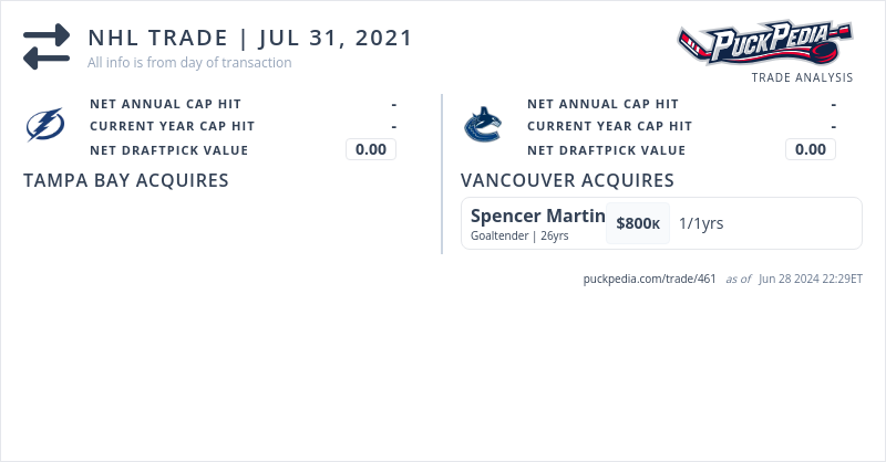 The Vancouver Canucks acquired Spencer Martin from the Tampa Bay Lightning for future considerations