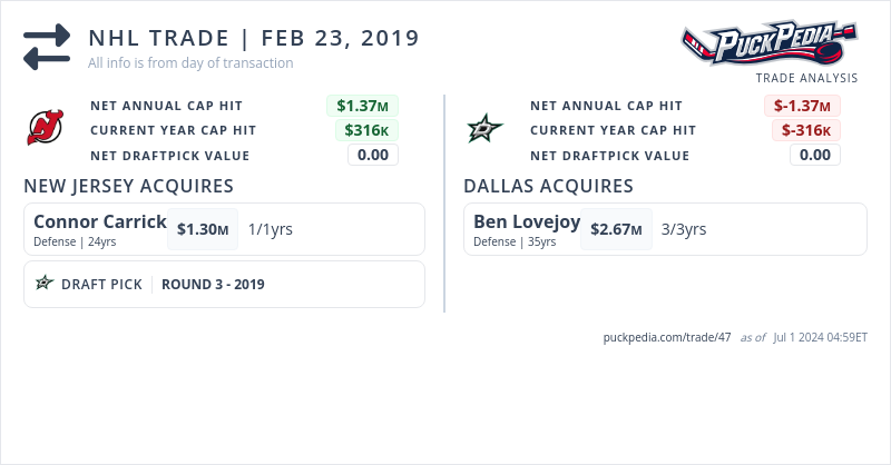 Dallas Stars acquired defenseman Ben Lovejoy from the New Jersey Devils in exchange for defenseman Connor Carrick and 3rd round selection in the 2019 Draft