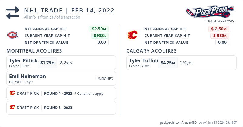 The Calgary Flames acquired Tyler Toffoli from the Montreal Canadiens for Tyler Pitlick, Emil Heineman, 2022 conditional first round pick and 2023 fifth round pick