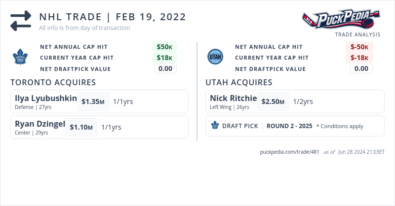The Toronto Maple Leafs acquired Ryan Dzingel and Ilya Lyubushkin from the Arizona Coyotes for Nick Ritchie and conditional pick (2023 third round pick OR 2025 second round pick)