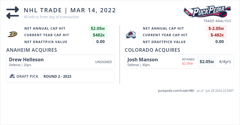 The Colorado Avalanche acquired Josh Manson from the Anaheim Ducks for Drew Helleson and 2023 Second Round Draft Pick