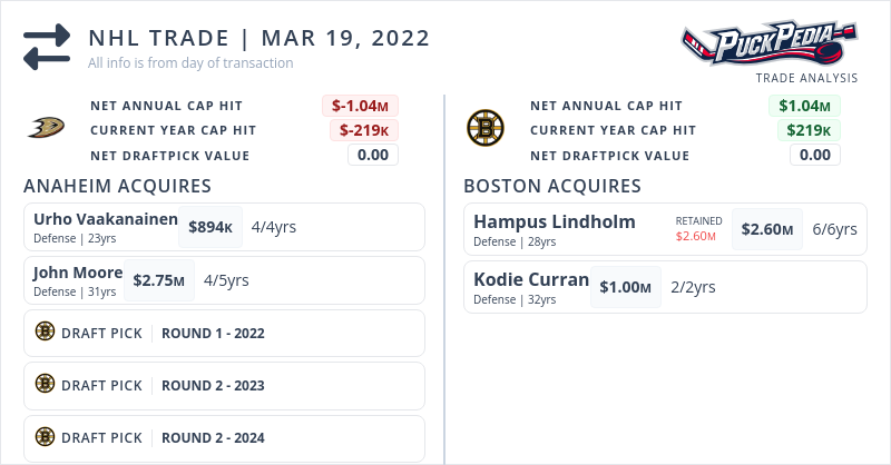 The Boston Bruins acquired Hampus Lindholm and Kodie Curran from the Anaheim Ducks for Urho Vaakanainen, John Moore, 2022 first round pick, 2023 second round pick, and 2024 second round pick