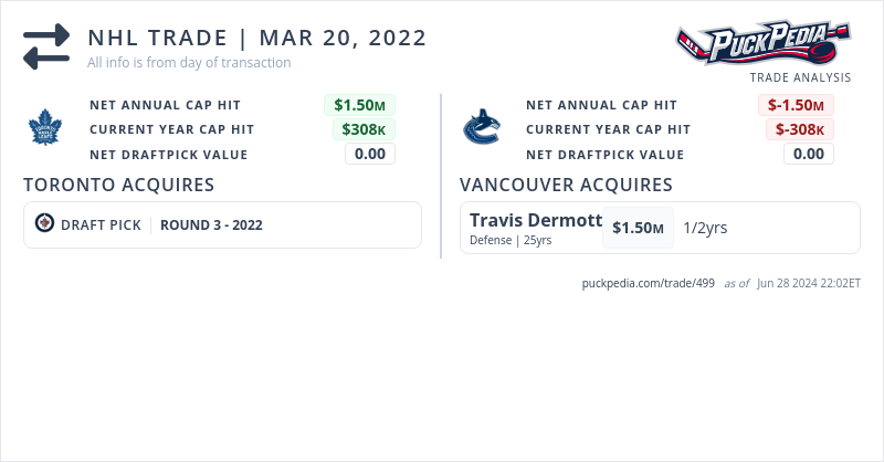 The Vancouver Canucks acquired Travis Dermott from the Toronto Maple Leafs for a 2022 third round pick