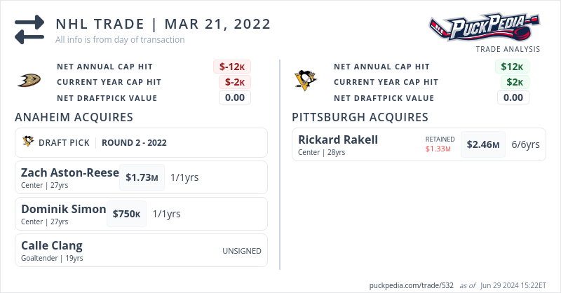 The Pittsburgh Penguins acquired Rickard Rakell from the Anaheim Ducks for 2022 second round pick, Zach Aston-Reese, Dominik Simon, and Calle Clang