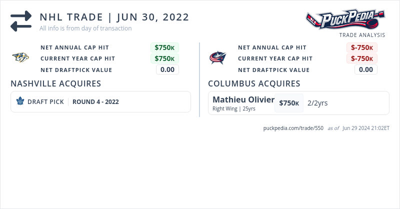 The Columbus Blue Jackets acquired Mathieu Olivier from the Nashville Predators for a 2022 fourth round pick (#122 from Toronto)