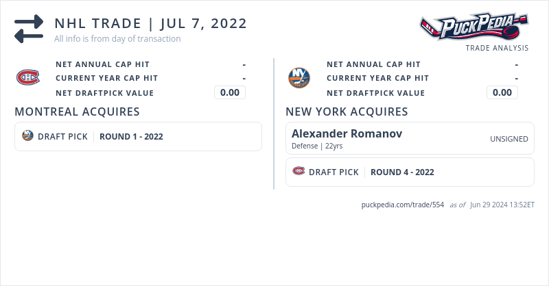The New York Islanders acquired Alexander Romanov and 2022 4th round pick (#98) from Montreal Canadiens for 2022 1st Round Pick (#13)