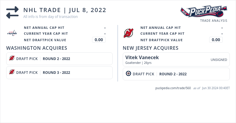 The New Jersey Devils acquired Vitek Vanecek and 2022 second round pick (#46) from the Washington Capitals for 2022 second round pick (#37) and 2022 third round pick (#70)