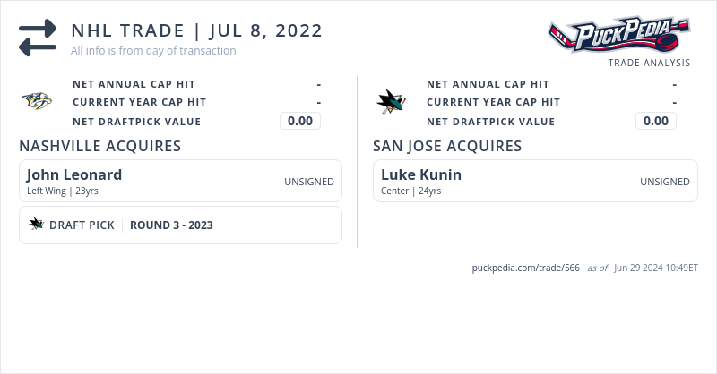 The San Jose Sharks acquired Luke Kunin from the Nashville Predators for John Leonard and 2023 third round pick