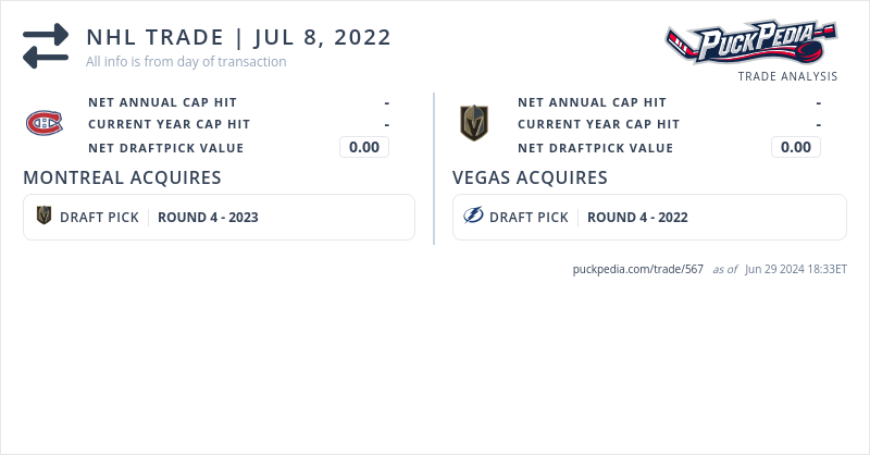 The Vegas Golden Knights acquired 2022 fourth round pick (#128) from Montreal Canadiens for 2023 fourth round pick