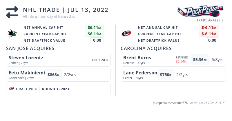 The Carolina Hurricanes acquired Brent Burns and Lane Pederson from the San Jose Sharks for Steven Lorentz, Eetu Makiniemi, and conditional 2023 third round pick