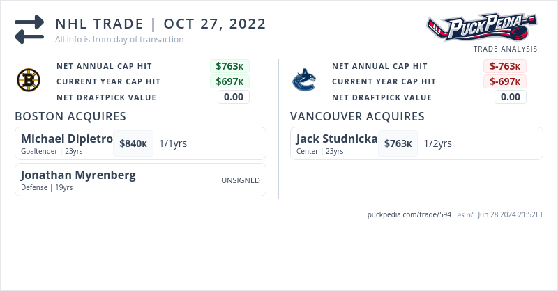 The Boston Bruins acquired Michael DiPietro and Jonathan Myrenberg from Vancouver Canucks for Jack Studnicka