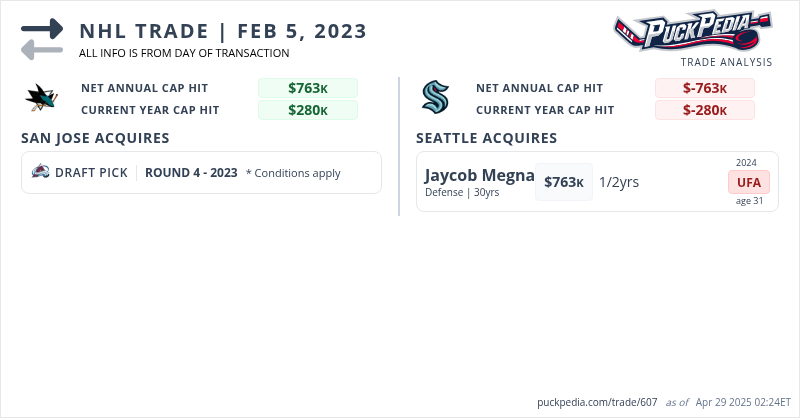 The Seattle Kraken acquired Jaycob Megna from the San Jose Sharks for a conditional 2023 fourth round pick