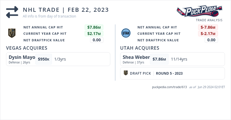 The Arizona Coyotes acquired Shea Weber and 2023 5th round pick from the Vegas Golden Knights for Dysin Mayo
