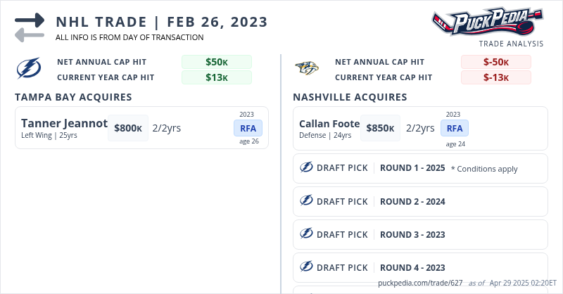 The Tampa Bay Lightning acquired Tanner Jeannot from the Nashville Predators for Cal Foote, a 2025 1st round pick, 2024 2nd round pick, 2023 3rd round pick, 2023 4th round pick, and 2023 5th round pick.