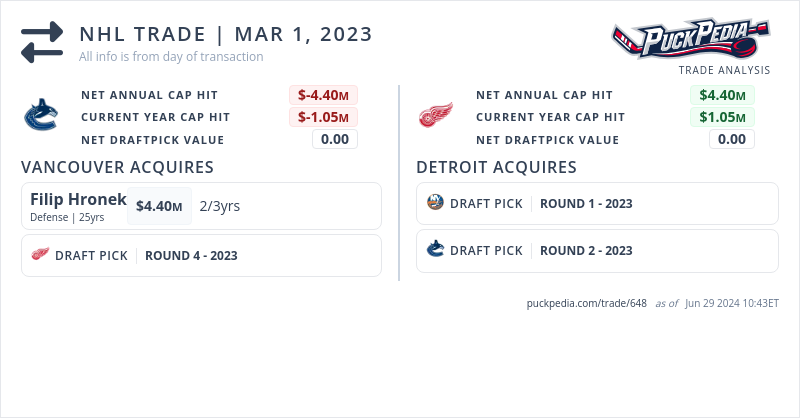 The Vancouver Canucks acquired Filip Hronek and a 2023 fourth round pick from the Detroit Red Wings for a 2023 first round pick and 2023 second round pick