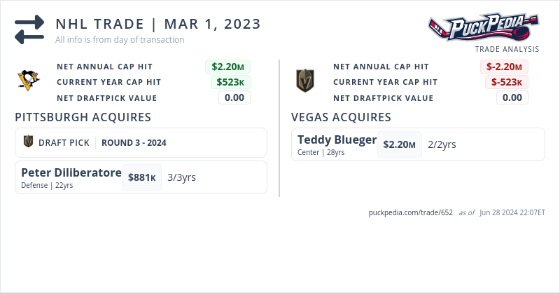The Vegas Golden Knights acquired Teddy Blueger from the Pittsburgh Penguins for Peter DiLiberatore and a 2024 3rd Round Pick