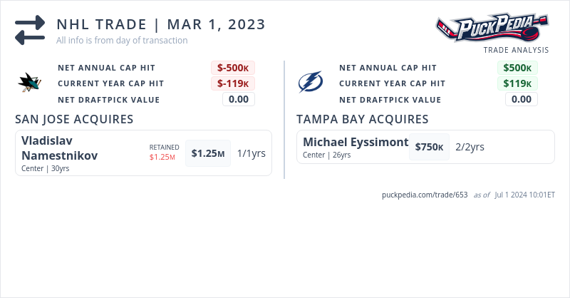 The San Jose Sharks acquired Vladislav Namestnikov from the Tampa Bay Lightning for Michael Eyssimont.
