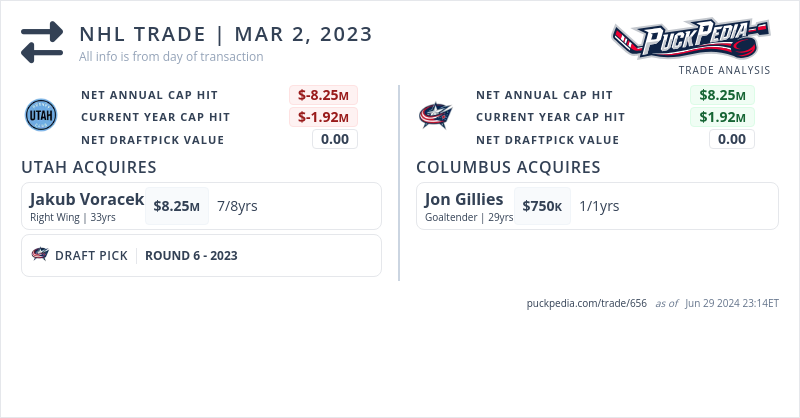 The Arizona Coyotes acquired Jakub Voracek and a 2023 6th round pick from the Columbus Blue Jackets for Jon Gillies
